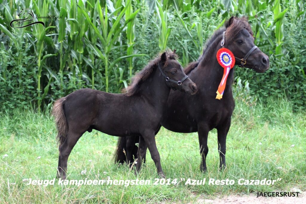 Met spanning hebben we op de geboorte van het veulen van Tyana / Hobby Horse Fabio gewacht, dit zou op Stal Jaegersrust het 1ste veulen van deze kleurrijke hengst zijn, in combinatie met de kleine zwarte merrie Tyana. Op 15-05-2014, keurig volgens het boekje, in de avond een vlotte geboorte van een geweldig mooi klein hengst veulen met een egale leverachtige kleur, en 2 blauwe ogen, die in een charmant gewelfd hoofdje wijs de wereld in keek. De kleur van dit hengst veulen deed ons denken aan onze “blauwe” Deense Dog van 20 jaar geleden. Azul staat voor de kleur blauw, en in wat voor kleur het ook mag eindigen, het begin van zijn “vacht kleur” carriere is hiermee vastgelegd.