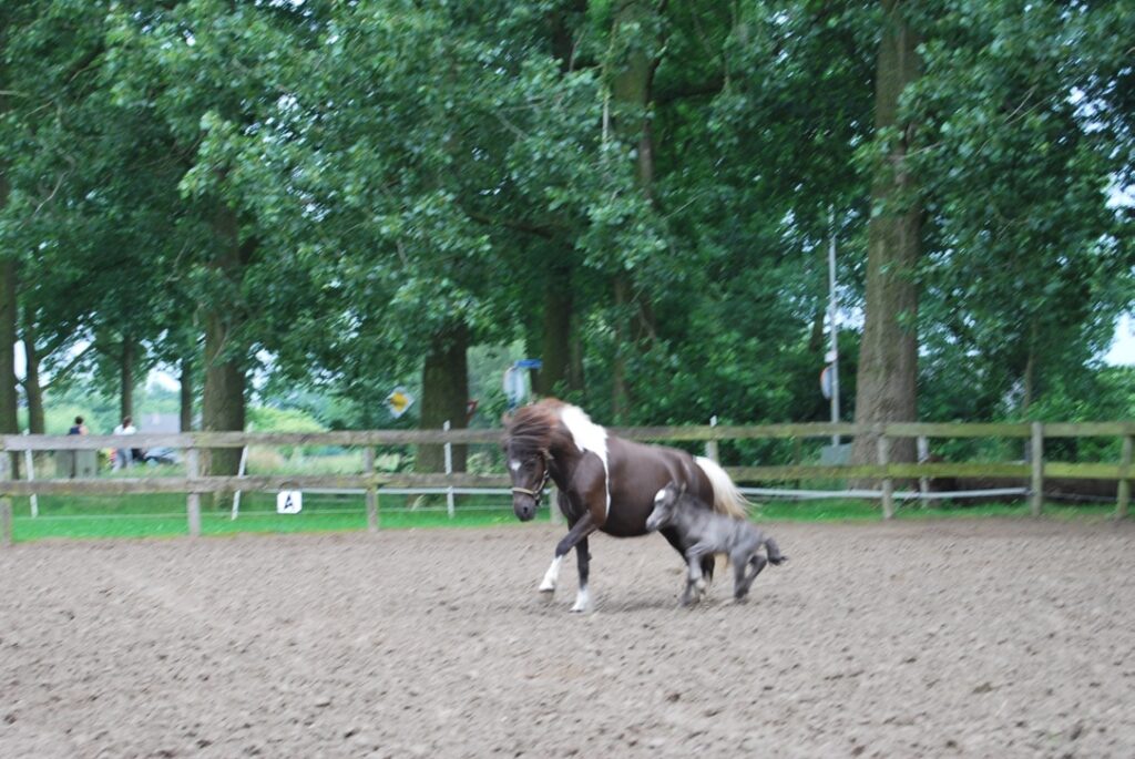 Op 01-07-2016 heeft onze merrie Fata Morgana / Toyland Antigo haar eerste veulen ter wereld gebracht. Na een olifanten dracht van 12 maanden en 1 week, werd dit beeldschone klein maar fijn gebouwde Falabella hengst veulen geboren. Met het geboorte alarm vanaf half mei in werking was het een angstig lange tijd. Geen twijfel over de drachtigheid maar onrust over de lange duur. De natuur heeft zijn eigen regels, het is af als het pas af is, en dus niet eerder ! Maar als je gewend bent dat ( onze) Falabella merries meestal 14 dagen voor de uitgerekende datum bevallen was het wachten een lesje in geduld en vertrouwen. Op 01-07-2016 in de avond was het dan zover, en met een voorspoedige bevalling is dit Falabella hengst veulen geboren. Aan de duur van de dracht verwacht je een stevig en groter veulen, maar niets is minder waar. Een hoofdje met een zo gewenst disje zoals we deze van de vader herkennen, en met heel fijn beenwerk. Voor nu, met 2 licht blauwe oogjes in een zilvergrijs vachtje. Op stal beweegt hij zich nieuwsgierig naar je toe, en laat zich graag aanraken, buiten beweegt hij zich lichtvoetig en vol vertrouwen achter zijn moeder aan. Genetisch hebben we voor de toekomst hoge verwachtingen van dit mannetje, een Falabella merrie Fata Morgana met uitmuntende bloedlijnen en een bijzonder lief enthousiast en vrolijk karakter, en een vader die keer op keer kampioens veulens heeft verwekt.